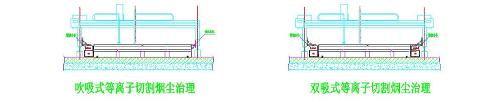 等離子切割所產(chǎn)生的煙粉塵主要集中于臺面下方、可通過滑動風道配合吸風小車進行收集治理 ,建議一般切割平臺≤4m可采用吹吸式收集,切割平臺≥4m的可采用雙吸式進行收集。